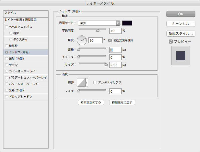 最後にレイヤー > レイヤースタイル > シャドウ(内側)で、塗りの色を黒に、↓ のように指定しました。