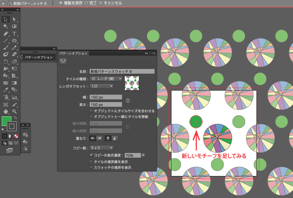 ちなみに、1.でモチーフの背面に配置した透明な四角形も、パターンオプションの幅と高さで調節してモチーフの並びの密度を変えられます。