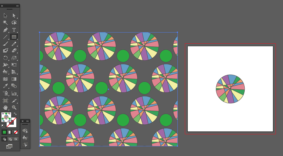 配置出来ましたら、四角形とモチーフ両方を選択し、そのままスウォッチパネルへドラッグします。(又は、両方を選択した状態で オブジェクト > パターン > 作成)